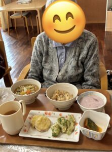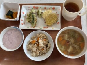 また、先月好評だった天ぷらも提供しました!ちくわの磯辺揚げ、さつまいもの天ぷらと、いつもよりも豪華なランチとなりました!
